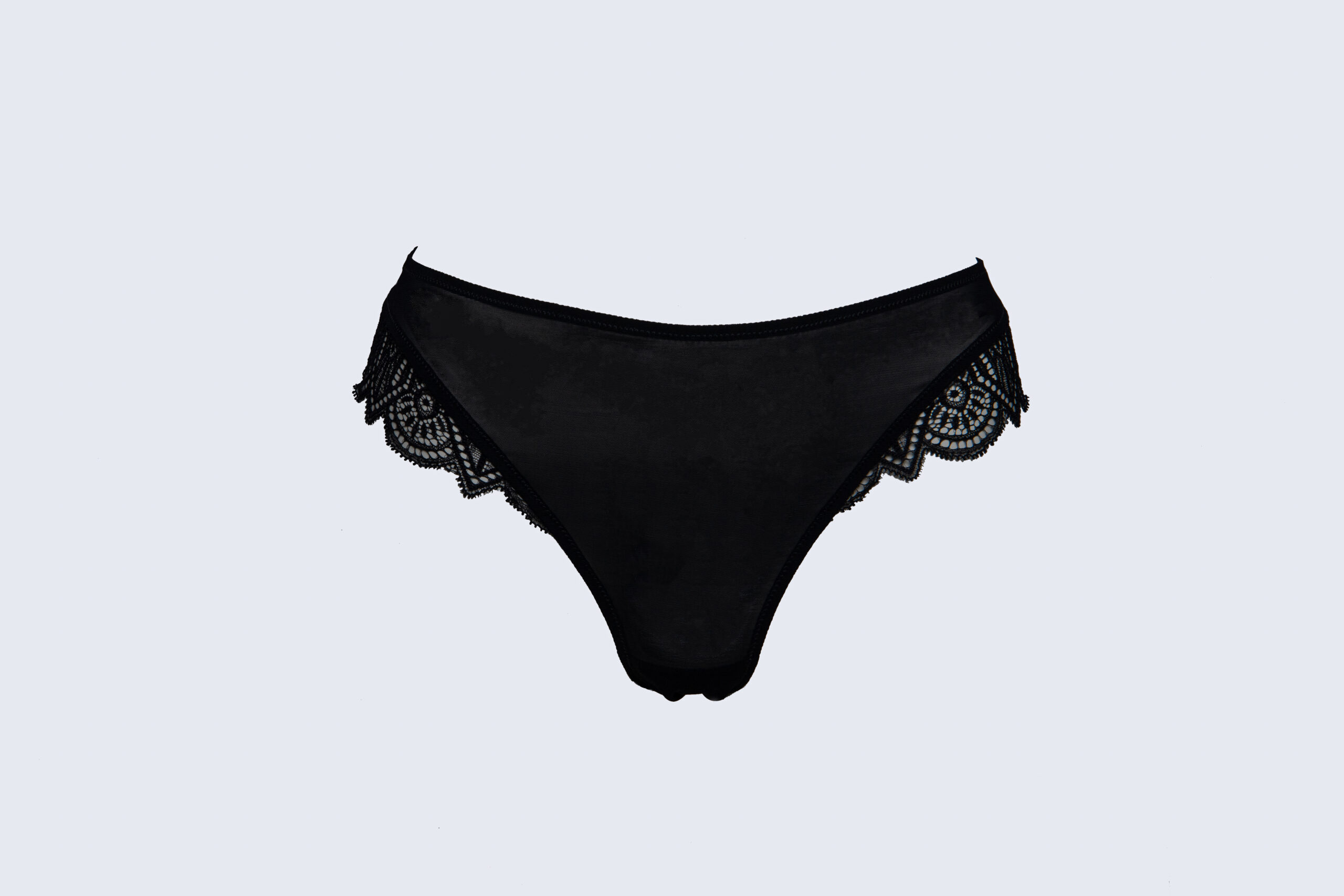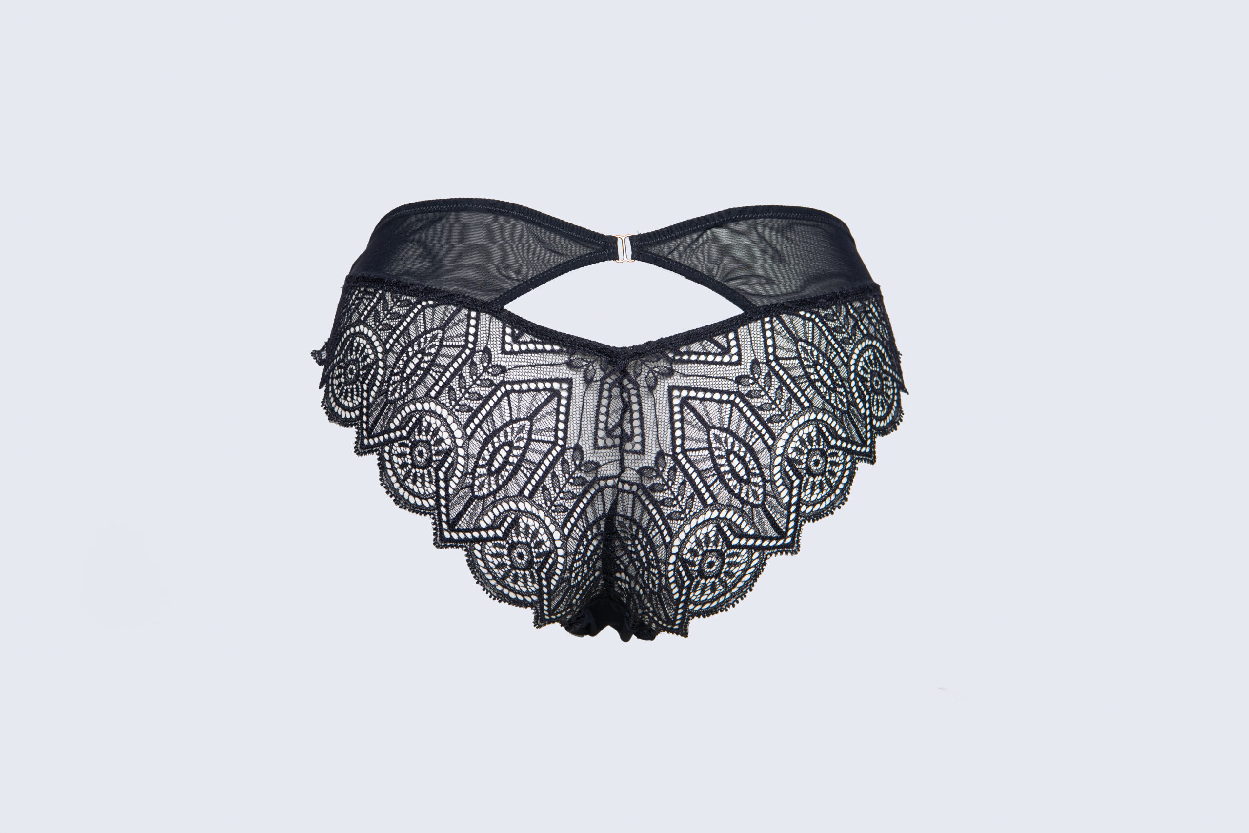 Intemporelle, la culotte insolente, de par sa dentelle délicate sans Polyester dévoilerons vos fesses avec subtilité. Le haut du dos en tulle est agrémenté d’un bijoux en rose gold.