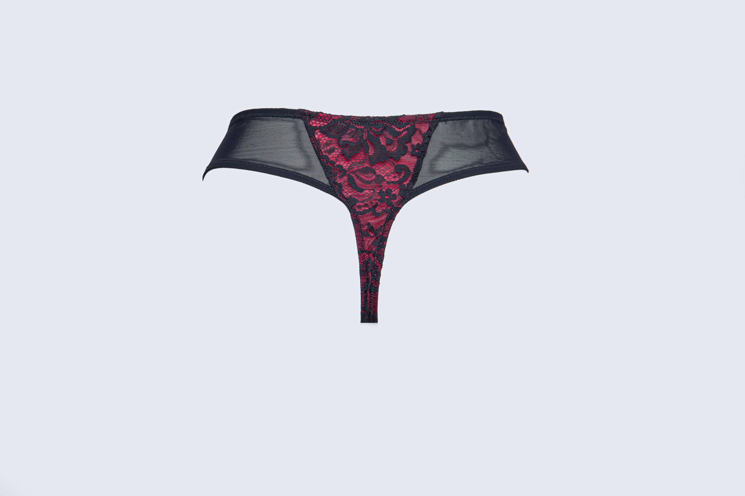 Audace, intemporelle, le tanga offre un confort et une élégance qui mettront vos formes en valeur. Le devant et le dos est agrémenté d’un tulle couleur framboise sublimant une dentelle de qualité ( label certifié OEKO-TEX®)